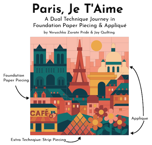 Description: In this immersive 6-hour workshop, students will explore the artful union of Foundation Paper Piecing (FPP) and Appliqué to construct a breathtaking quilt block that celebrates the charm and elegance of Paris. Inspired by the iconic landmarks and hidden beauty of the City of Light, this class invites quilters to create a stunning visual “love letter” using two distinct but harmonious techniques.