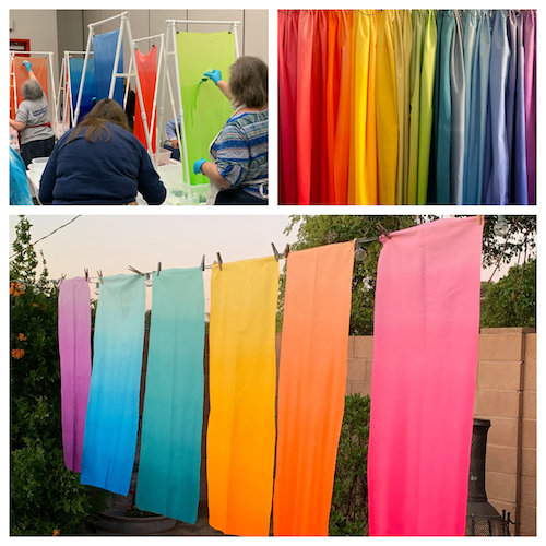 Kit Contents: All of the ½ yard cuts they can dye, a rainbow of dye, fixatives, gloves, dust mask, mixing cups, squeeze bottles, and Cindy's amazing Drip Rig
