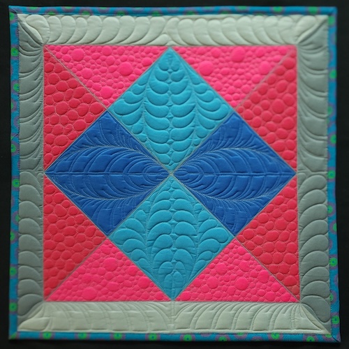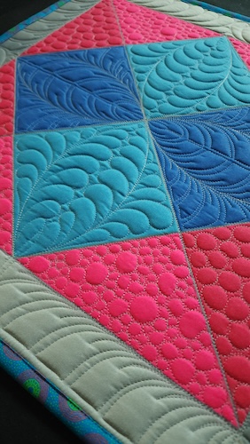 Description: Feathers are the ultimate design and a coveted skillset. Students will learn how to create stunning feathers, quickly, with Telene's tips, tricks and quirky reminders in this fun and satisfying class. 2 styles of feathers using 2 methods will be place in a block on a curved spine and in a border on a straight spine. The feathers will then be backfilled with wonderful organic pebbles in 2 styles. The world can be conquered with feathers and pebbles! One student per longarm frame machine will allow for maximum stitching time during this compact 3 hour class with achievable results and a class sample to take home.
